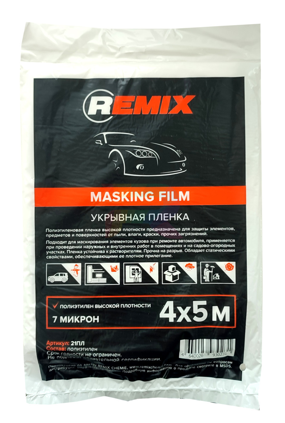 Укрывочная пленка Remix, надежно защищает рабочую поверхность от попадания различной лакокрасочной продукции, грязи и пыли. В индивидуальной упаковке. Толщина пленки: 7 микрон.